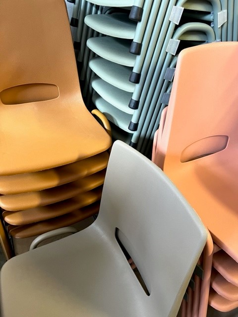Retro kuipstoel ton sur ton Stapelbare retro kuipstoelen in ton sur ton kleuren. Beschikbaar in: Okerbruin / RAL8001 Cementgrijs (groen) / RAL7033 Beige rood (roze) / RAL3012 Taupe / NCS-S5010 Afmetingen: D53cm x B47cm x H80cm, zithoogte 46cm PRIJS PER STOEL € 109,-